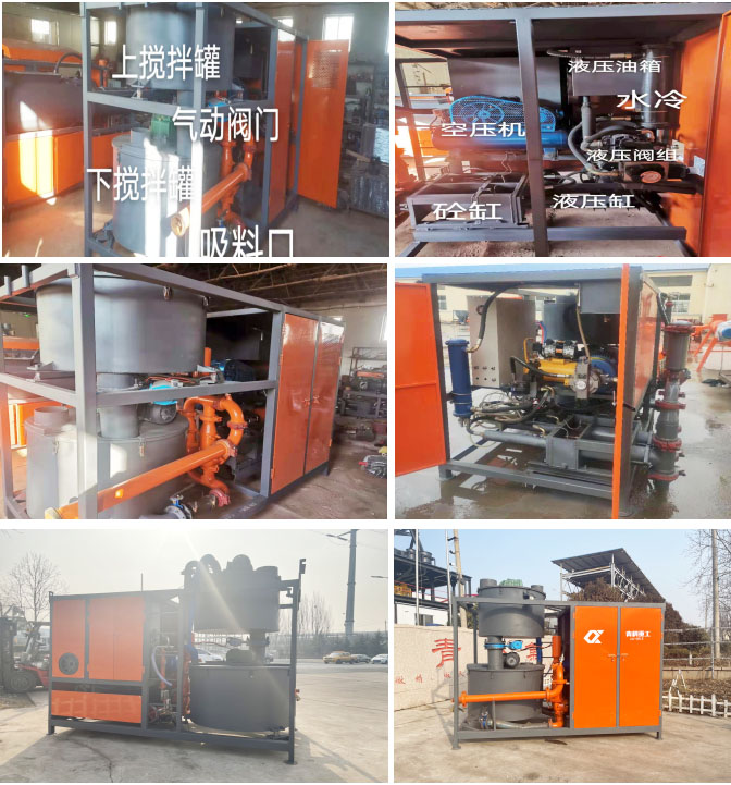 發(fā)泡系統(tǒng)采用大排量空壓機(jī)和發(fā)泡劑計(jì)量泵,通過PLC控制系統(tǒng)精確控制發(fā)泡劑和水的混合比例,在發(fā)泡倉中與空氣充分混合,從而產(chǎn)生符合密度要求的氣泡群。